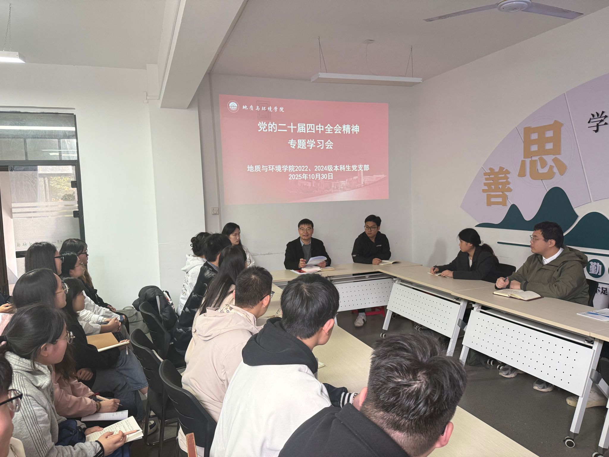 10月30日,学院2022、2024级本科生党支部在“一站式”员工社区组织党员集中学习党的二十届四中全会精神,支部全体党员参加学习,支部书记余小涛主持会议。