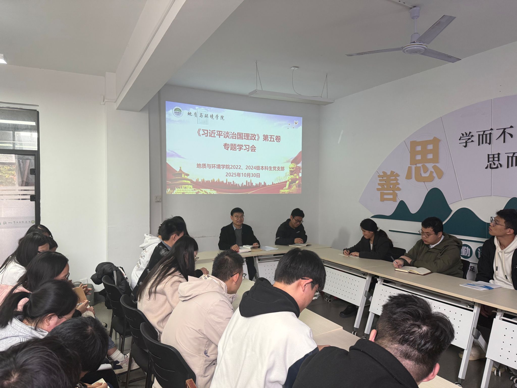 会议集中学习了“一体推进教育科技人才事业发展”章节内容。会议强调,作为青年学子,既要夯实专业知识根基,也要深刻理解“三位一体”战略布局的内在逻辑——教育为学科发展筑牢人才底座,科技为地质勘探、环境治理突破技术瓶颈,人才则是连接教育成果与科技创新的核心纽带。