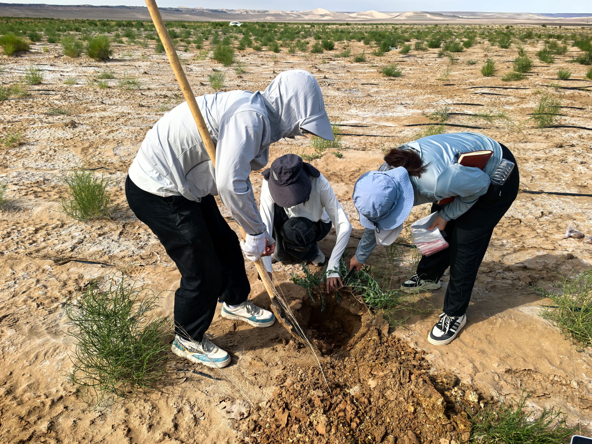 7月26日至8月5日,肖礼老师带领员工来到哈密,聚焦煤炭开采与环境保护的协调发展和高质量发展,首先对生态修复基地进行调查,观察土壤质地、植被生长状况并调研记录,并指导队员进行土壤、植物样本采样工作。