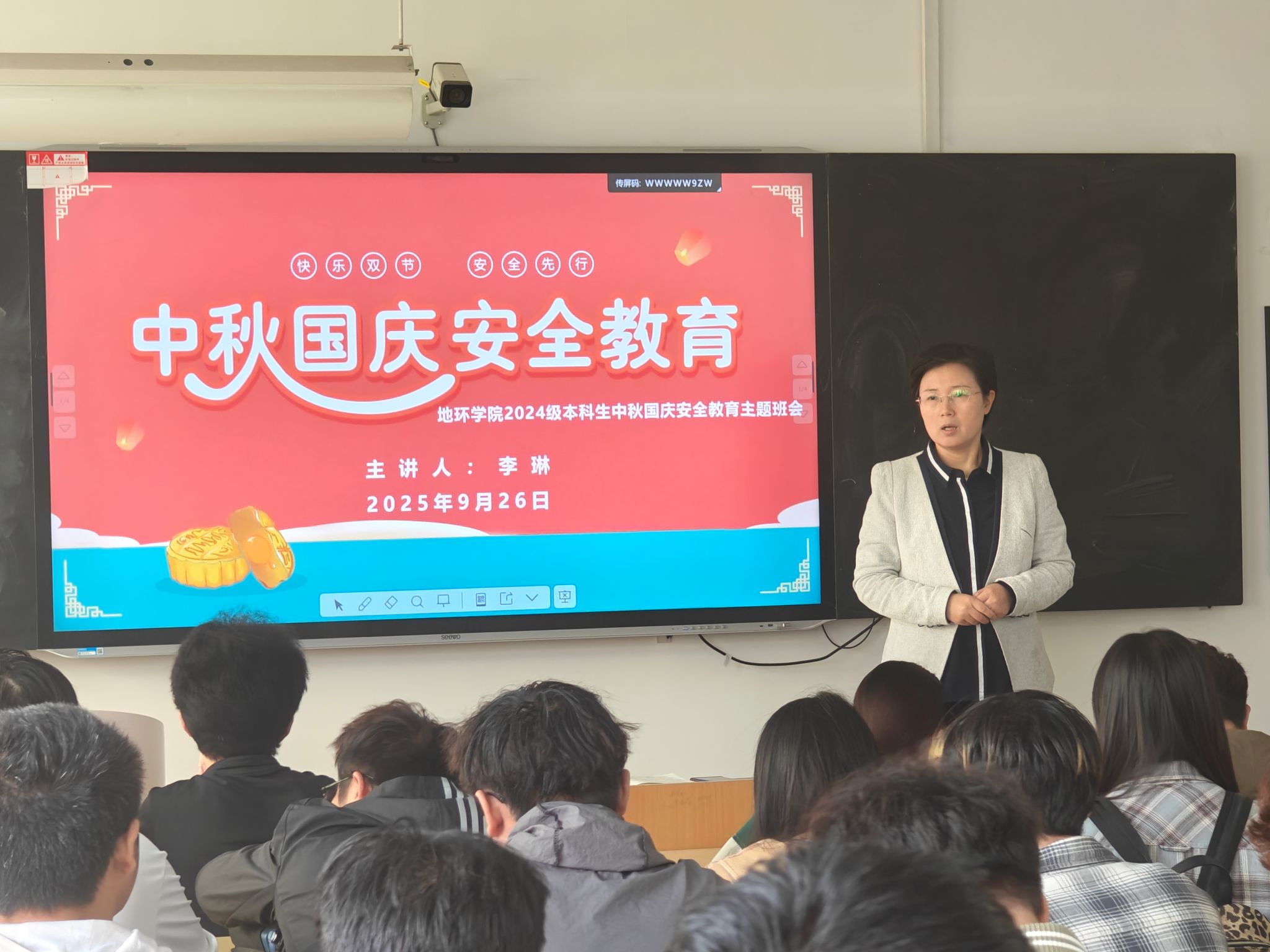 国庆中秋双节临近,为守护2024级本科生假期安全,9月26日至30日,学院学工办主任、2024级辅导员李琳分批次在1教413、1教505、11教501等教室,为9个班级开展假期安全教育主题班会,从七大维度送上“安全锦囊”。