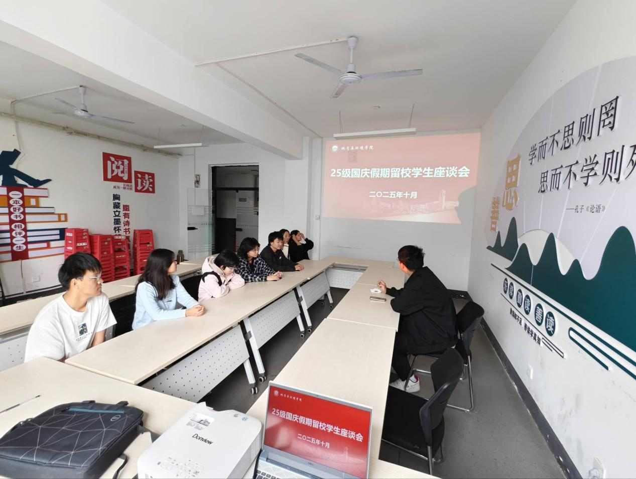 为全面掌握2025级新生入学适应情况,切实做好新生教育引导与管理工作,确保国庆中秋假期校园安全稳定,10月7日,学院于召开2025级留校员工座谈会。2025级辅导员周佳瑞主持,2025级留校员工代表参会。