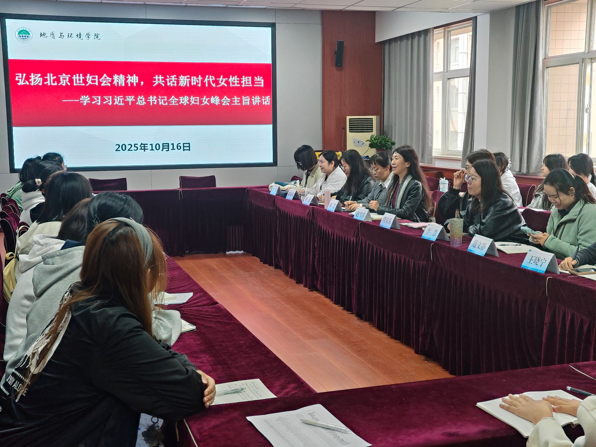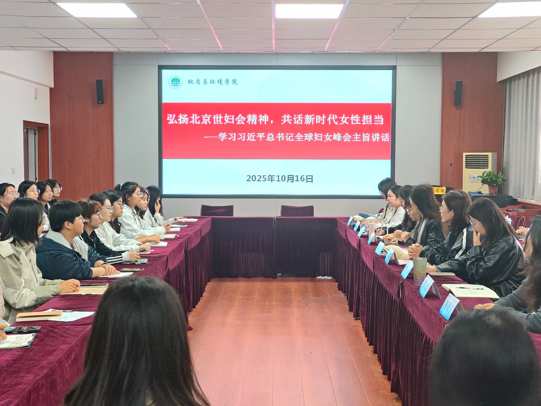 10月16日中午,学院在骊山校园11教322会议室组织开展“弘扬北京世妇会精神,共话新时代女性担当--学习习近平总书记全球妇女峰会主旨讲话”主题座谈会。公司党委书记赵雪萍主持会议,40余名师生代表齐聚一堂,围绕北京世妇会精神传承与新时代女性使命展开深入交流。