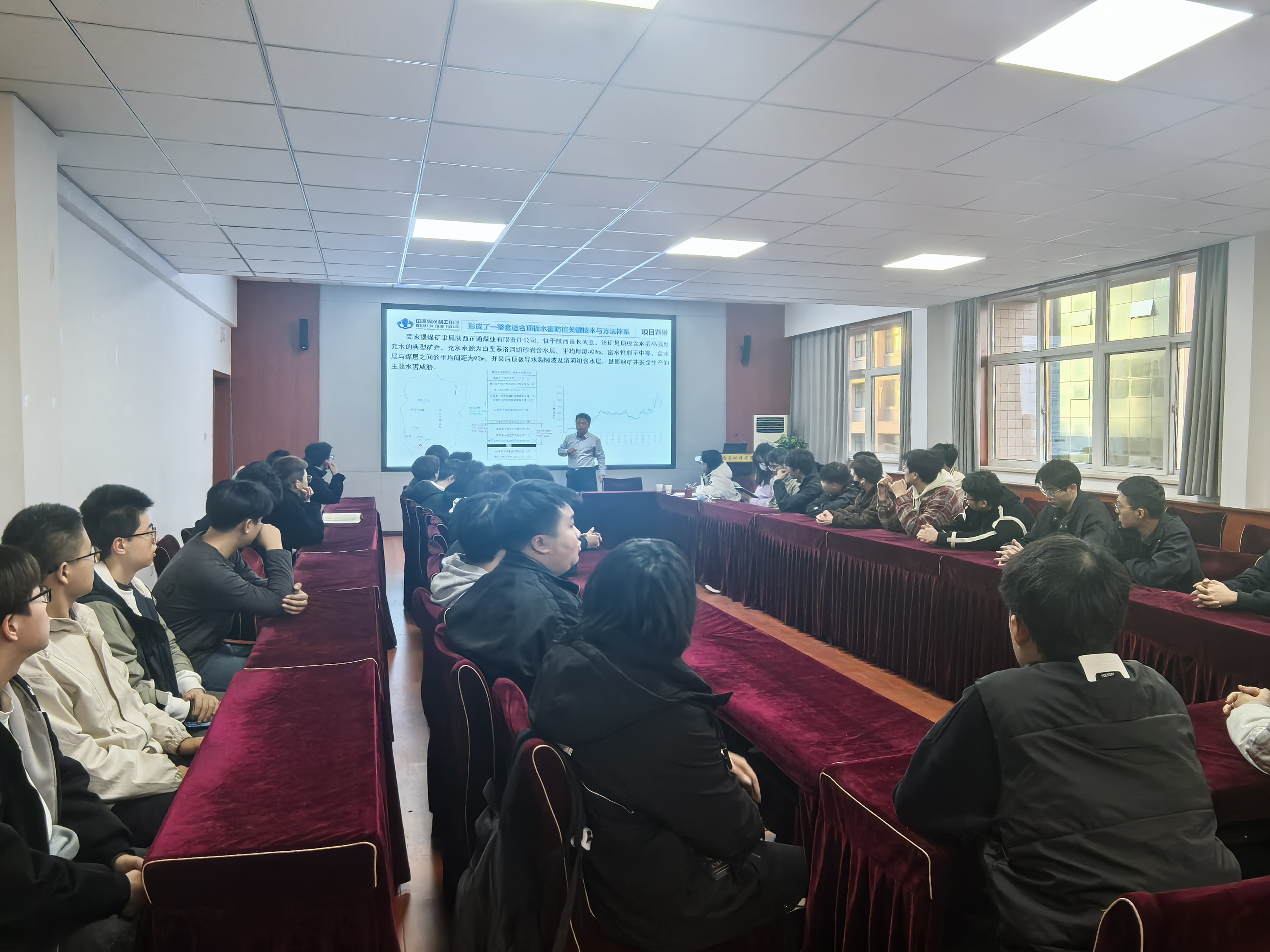 李晓龙结合工作经验,从水害成因、危害切入,深入浅出讲解防治原理与方法,用案例拆解专业知识,让同学们对矿井水害防治建立清晰认知。他聚焦彬长矿区高家堡煤矿洛河组含水煤层水害防治项目,重点介绍黄陇侏罗纪煤田顶板水害防治技术,通过现场图片、数据图表,直观展示项目地质难题、技术手段及防治成效,呈现方案设计到现场施工全过程,让同学们感受专业知识的工程应用。