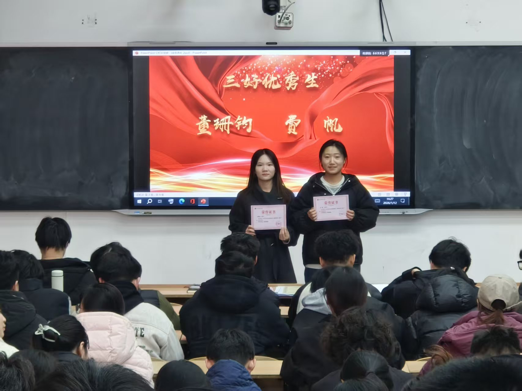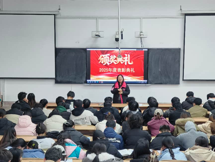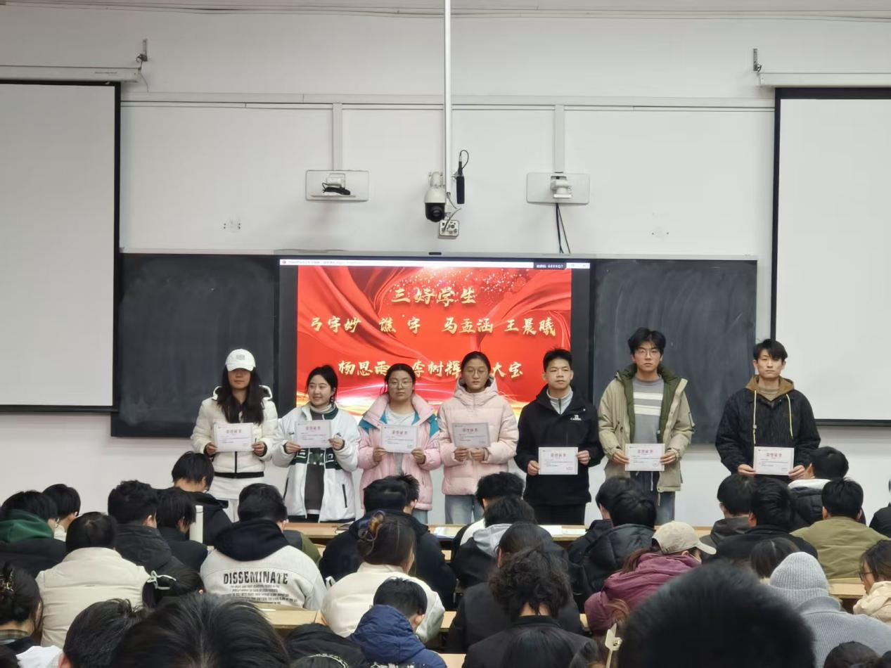为表彰先进典型、鲜明树立学习标杆,进一步凝聚全体学子的奋进力量,营造比学赶超、笃行实干的优良氛围,1月12日,学院2023级本科生2025-2026学年第一学期表彰大会在3教217教室举行。2023级全体本科生参会,辅导员韩蕊主持。