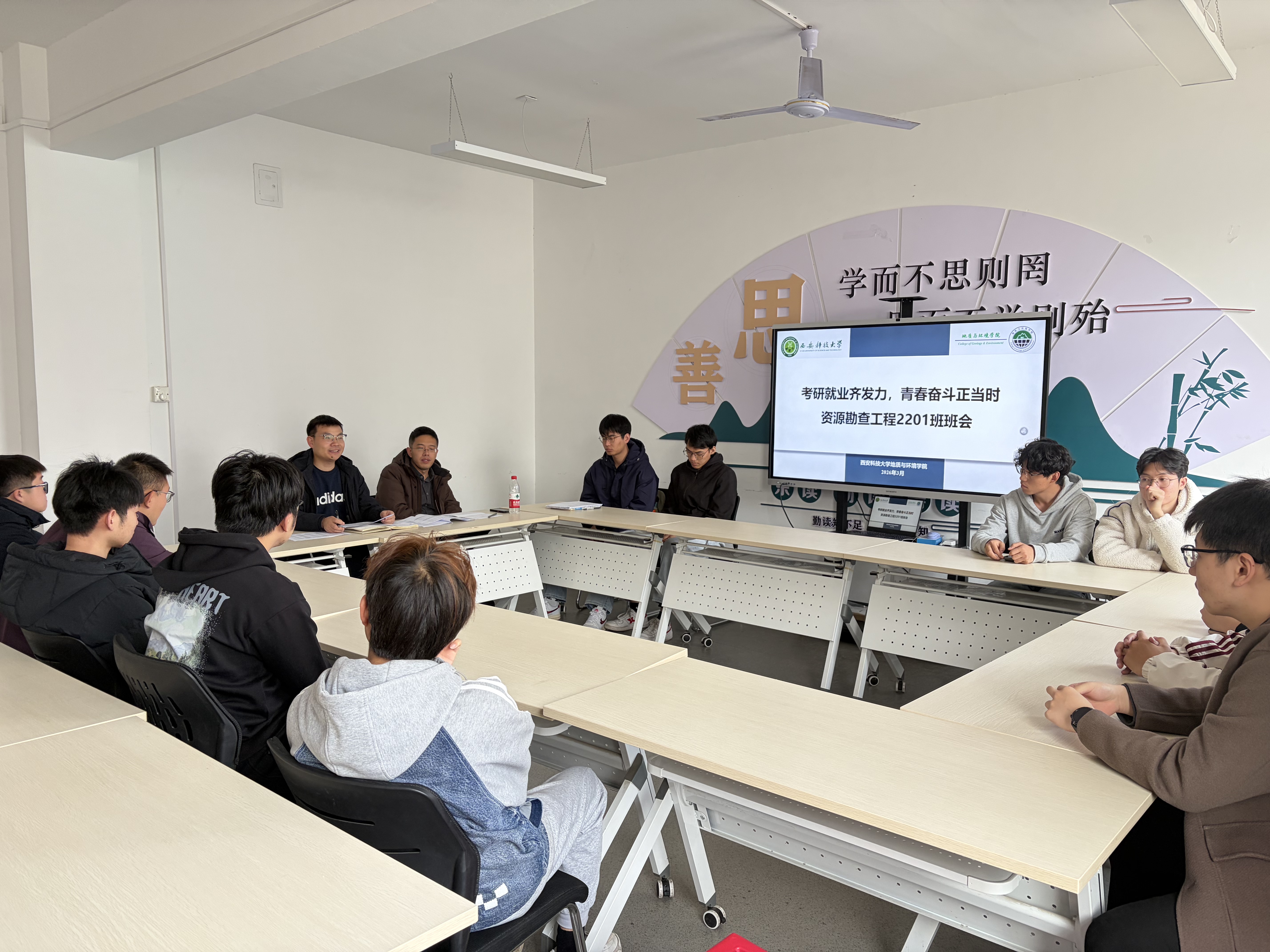 为帮助大四员工理清考研复试备战思路、破解就业求职难题、化解毕业季焦虑,3月19日,资源勘查工程2201班在“一站式”员工社区召开“考研就业齐发力,青春奋斗正当时”主题班会,凝聚奋斗力量,共赴前程之约。班主任郭晨老师及资源勘查工程2201班全体同学参加会议,会议由辅导员余小涛主持。